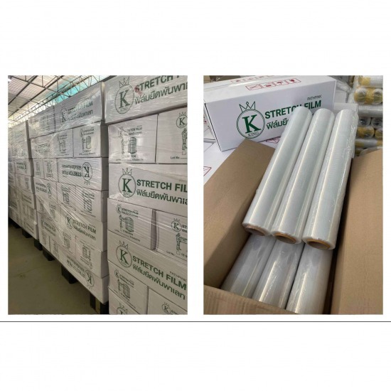 จำหน่ายฟิล์มยืด ฟิล์มพาเลทราคาโรงงาน ฟิล์มยืดยี่ห้อคิง (KING) ฟิล์มยืดพันพาเลทราคาโรงงาน เกรดพรีเมียม จำหน่ายราคาปลีก - ราคาส่ง ส่งฟรีทั่วประเทศ ยิ่งสั่งเยอะยิ่งถูก รุ่น สีใส 15x50xยืดได้ถึง 300 เมตร นน.1.64/ม้วน ( บรรจุ 6 ม้วน ) 15x25xยืดได้ถึง 300 เมตร นน.0.82 ม้วน ( บรรจุ 12 ม้วน ) รุ่น สีใส 17x50xยืดได้ถึง 500 เมตร นน.2.3 ( บรรจุ 6 ม้วน ) รุ่นสีดำ 15x50xยืดได้ถึง 200 เมตร นน.1.64ม้วน ( บรรจุ 6 ม้วน ) รุ่นสีดำ 15x25xยืดได้ถึง 200 เมตร นน.0.82 ม้วน ( บรรจุ 12 ม้วน ) รุ่น สีเขียว 15x50xยืดได้ถึง 200 เมตร นน.1.64ม้วน ( บรรจุ 6 ม้วน ) สีดำ ป้องกัดแสงยูวี5% และ ผลิตจากเม็ดพลาสติก LLDPE